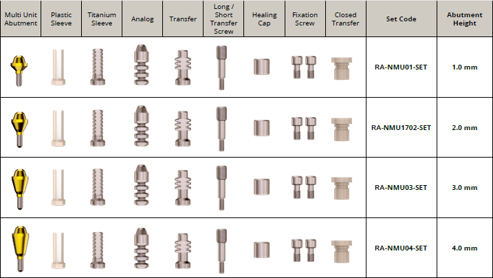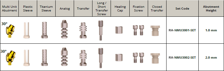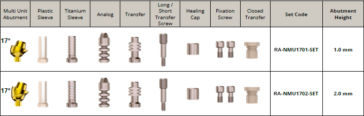 MULTI UNIT SYSTEM - NP STRAIGHT MULTI UNIT ABUTMENT Screw included FULL SET ANGULATED MULTI UNIT 17 DEGREES Screw included FULL SET ANGULATED MULTI UNIT 30 DEGREES Screw included FULL SET FULL ACCESSORIES INFORMATION TABLE
